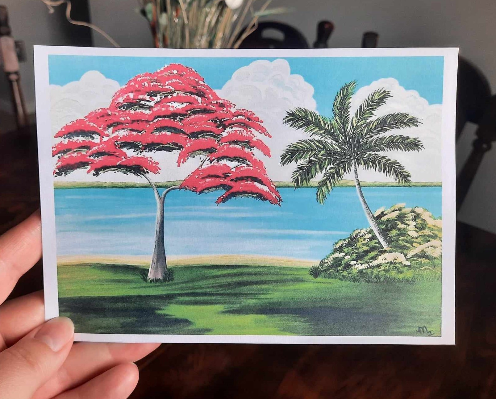 Royal Poincianas are one of my favorite trees. Their bright crimson flowers make me happy each late spring when they begin to emerge. This piece was inspired by the work of the Florida Highwaymen.